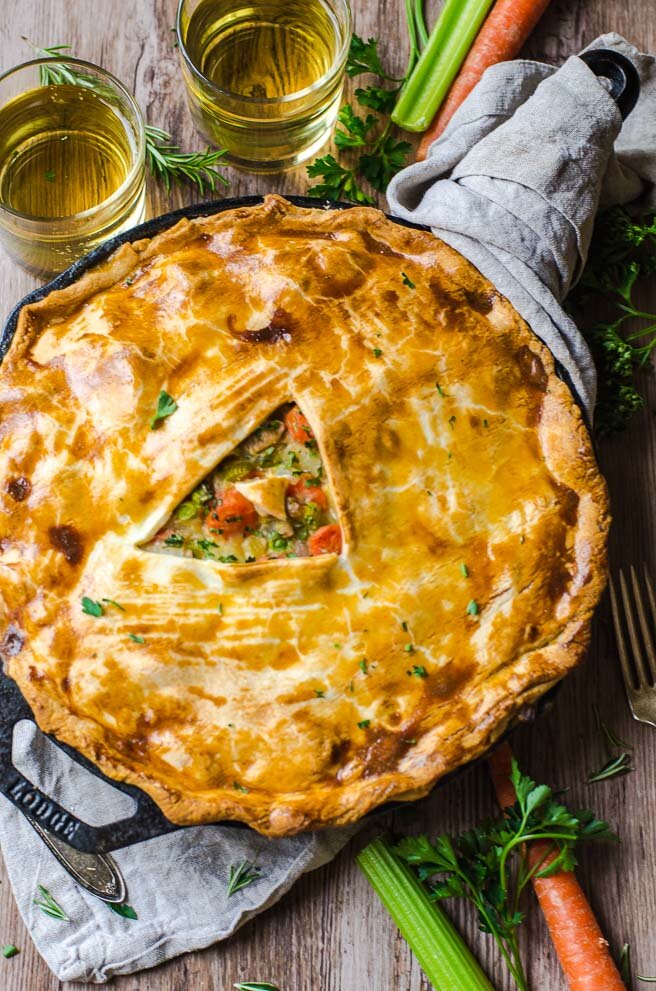 Накройте сковороду приготовленной «крышкой» из теста сверху, заправляя края по мере необходимости. Вырежьте небольш