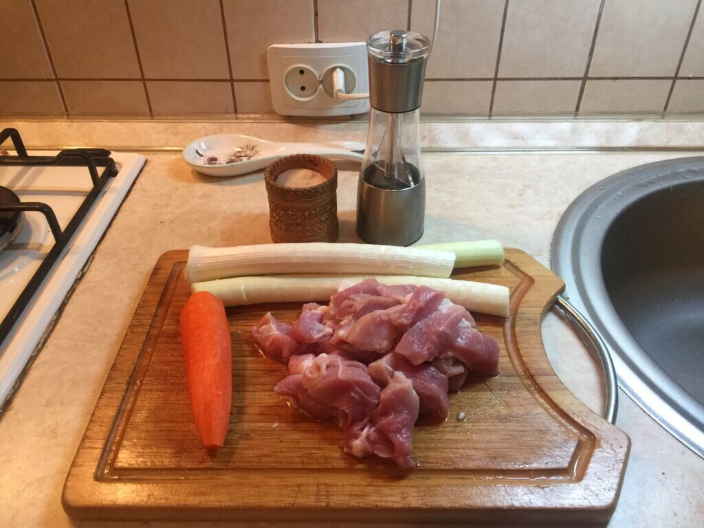 Ингредиенты: Способ приготовления: Нарезаем лук порей, обжариваем на растительном масле на сильном огне 3 минуты, добавляем порезанную соломкой морковь и ещё 3 минуты обжариваем. К овощам кладем мясо, ещё немного обжариваем все вместе. Добавляем соль, перец. Добавить 2 стакана воды и тушим на медленном огне еще час. В процессе тушения можно пробовать соус и добавлять соль и специи по вкусу. В конце можно добавить зелень. Приятного аппетита! Оригинал: https://glaved.ru/svinina-tushenaja-s-lukom-poreem/