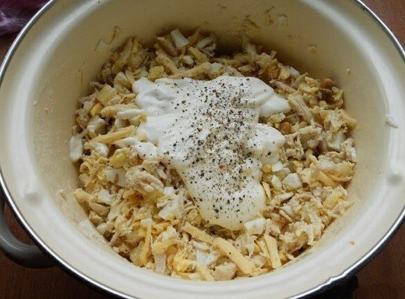 Нежный и невесомый салат в тарталетках станет достойным украшением праздничного стола, такое решение пойдет даже для фуршета. Для салатика нам потребуется двести грамм отварного куриного филе, двести грамм ананасов, сто грамм твердого, острого сыра, пару зубков чеснока, тридцать грамм орехов грецких, пару вареных яиц, соль, перец, майонез, тарталетки. Филе режем кубиком, к нему добавляем квадратиками ананасы. Сыр трем не терке, орехи рубим ножом или также натираем. Смешиваем все компоненты. В последний момент добавляем тертые яйца, чеснок, соль, перец и майонез. Все как следует перемешиваем. Наполнять наши корзиночки нужно перед самой подачей на стол. Сверху можно слегка задекорировать зеленью и посыпать щепоткой тертого ореха. Если майонез вам кажется сильно жирным, можно его заменить оригинальным соусом из сметаны, лимонного сока, горчицы. А вот сыр лучше выбрать острого сорта, который будет приятно выделяться на фоне нежного куриного мяса и вареных яиц. Кстати, если не можете най