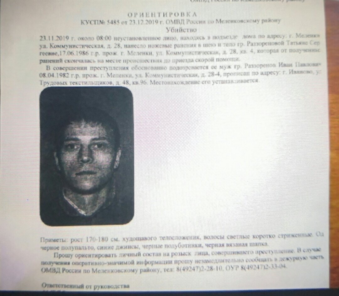 Дело было в маленьком городке Меленки. Бывший супруг Иван подкараулил Татьяну в её подъезде и нанёс несколько ножевых ударов. Причиной стала дикая ревность, мужчина не оставлял попыток вернуть женщину, преследовал её и всячески донимал. После убийства Иван Раззоренов сбежал и прятался по заброшенным зданиям, но оперативники быстро вышли на него. Теперь ему грозит большой срок за умышленное убийство.