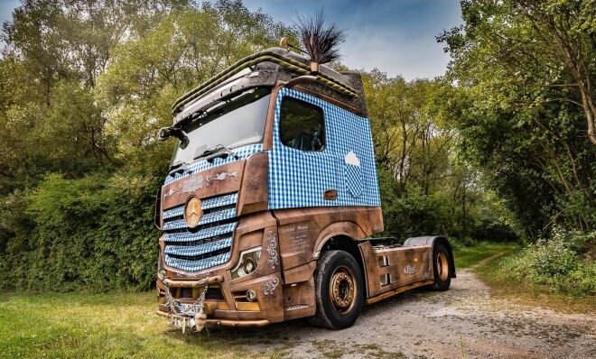 Немецкие компании Josef Paul и Design Garage сделали очень необычный тюнинг. Они модернизировали новый Actros таким образом, что почти невозможно описать этот стиль в нескольких словах. Это своего рода сочетание народных, западных и пикниковых мотивов с имитацией дерева и... веток. Например, диски и трубчатые аксессуары сделаны под дерево. Двери и решетка радиатора были выполнены в стиле скатерти. Крышу сделали как имитацию камня, а остальные части напоминает шкуру животного. Среди прочего, имеется цепочка с ручными инструментами, верхний трубчатый молдинг напоминает оплетку, сбоку от ящика для хранения что-то вроде кармана для салфеток. Заслуживает внимания и логотип Mercedes, словно деревянная табличка.