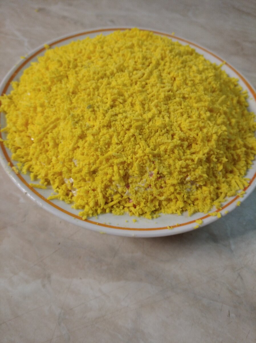 Салат с яблоком Ингредиенты Куриные яйца -3шт. Сливочное масло-50гр. Плавленый сырок -1 шт. Яблоко кисло-сладкое -1шт. Крабовые палочки-200гр. Майонез-200гр. Готовится салат слоями 1-й слой : тёртые на крупной тёрке белки Майонез 2й слой : замороженное сливочное масло; Майонез 3-й слой: плавленый сырок тертый на крупной тёрке; Майонез 4-й слой: очищенное от кожуры яблоко , тёртое на крупной тёрке; Майонез 5-й слой : мелко нарезанные или тёртые крабовые палочки; Майонез Сверху украшаем тёртыми на мелкой тёрке яичными желтками Салат готовится очень быстро,и получается очень нежный Приятного аппетита