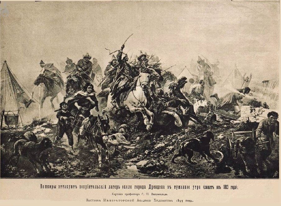 Башкиры атакуют неприятельский лагерь около города Дрездена в туманное утро (сюжет из 1813 года) Картина профессора Г.П.Виллевальде. Выставка Императорской Академии Художеств 1893 года.