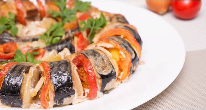 Форму для запекания смазываем растительным маслом и выкладываем скумбрию, чередуем рыбу с овощами.