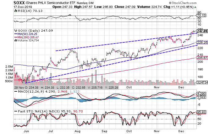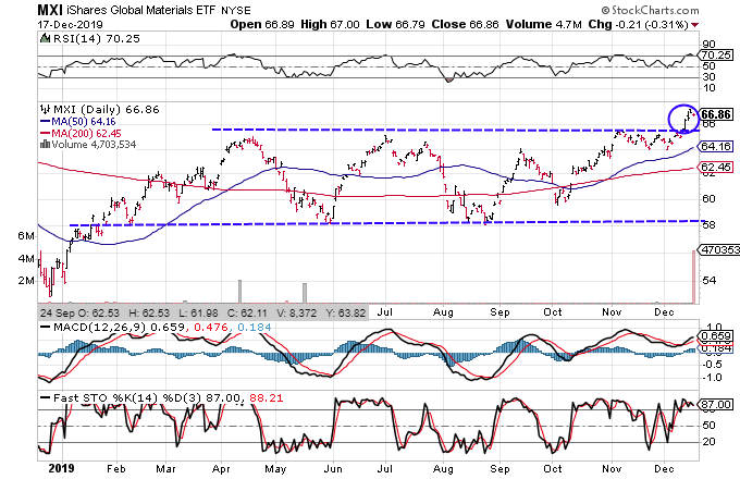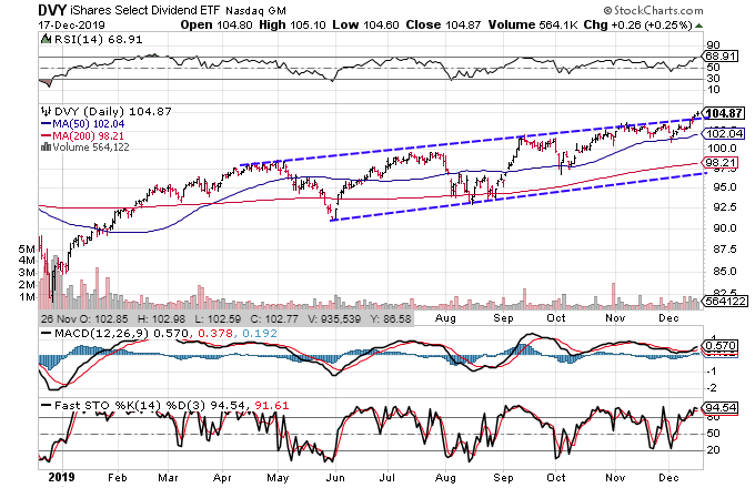 Долгосрочные трейдеры часто используют последние недели календарного года, чтобы просмотреть свои портфели и внести коррективы, которые помогут позиционировать их для достижения успеха в следующем году. Как вы прочтете в нижеследующих параграфах, в случае 2019 года несколько широких тем, таких как сильные компании, которые платят дивиденды, материалы и полупроводники, представляют особый интерес и могут стоить увеличить вероятность перехода к 2020 году. Дивиденды Активные трейдеры, которые хотят получить доступ к компаниям с последовательной историей выплаты дивидендов в течение пяти и более лет, могут захотеть взглянуть на iShares Select Dividend ETF (DVY). Как видно из приведенного ниже графика, цена фонда торгуется в определенном диапазоне с первых дней лета. Для тех, кто следит за техническим анализом, стоит отметить, что восходящий наклон долгосрочных скользящих средних предполагает, что быки контролируют импульс. Поскольку скользящие средние действовали в качестве сильных уровн