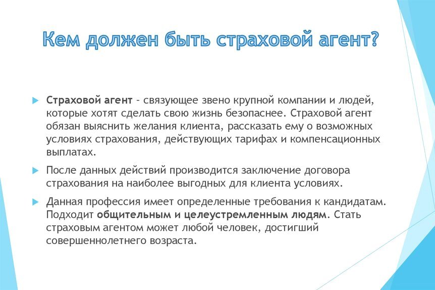 - поиск клиентов, заключение соглашений, продажа полисов;