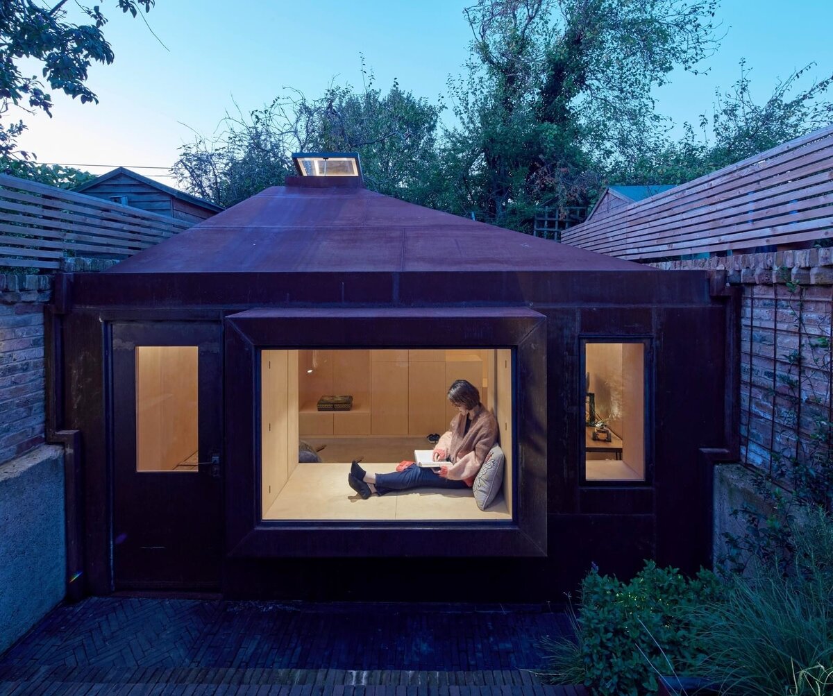 Архитекторы RISE Design Studio представили проект скрытой в саду студии Brexit Bunker в Лондоне, Великобритания, созданной в качестве дополнения к основному дому без вмешательства в его конструкцию. Студия соединена с домом посредством вымощенного глиняной плиткой внутреннего дворика, который является современным дополнением, но согласуется с восстановленными кирпичами, используемыми для возведения садовых стен. Внутри помещения создана наполненная светом и приятно удивляющая тёплая атмосфера, где золотые лучи игриво касаются встроенных столярных изделий из берёзовой фанеры. Серия блоков для хранения и испанские ступени ведут к световому люку, под которым можно расслабиться в окружении звуков птиц без визуального намёка на то, что вы находитесь в городе, а не в деревне. HQROOM — ежедневно об архитектуре и инновационном дизайне интерьера