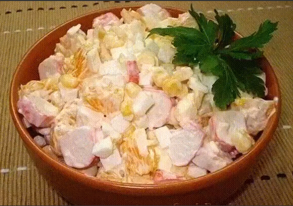 Ингредиенты: - крабовые палочки - 7шт - апельсин - 1шт - яйца - 4шт - чеснок - 1 зубчик - кукуруза консервированная - 100г - майонез - 100 - 150г Приготовление: 1. Подготовить продукты. Крабовые палочки разморозить. Яйца сварить вкрутую. 2. Яйца очистить и нарезать мелкими кубиками, крабовые палочки поперек, на небольшие ломтики. 3. Зубчик чеснока очистить и мелко нарубить ножом. 4. Апельсин очистить от кожуры. Разобрать на дольки. Каждую дольку очистить от пленок, затем нарезать. 5. Соединить подготовленные продукты, добавить майонез и аккуратно перемешать. 6. Салат выложить в салатник и подать.