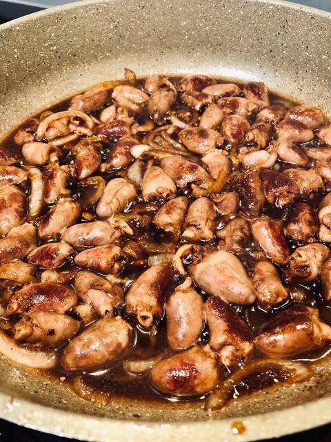 - Когда лук приобрел золотистый цвет, а сердечки поджаренные бочка, заливаем всё это соевым соусом (как на фото), добавляем мед, перемешиваем и на медленный огонь под крышку на 10 мин. Пару раз перемешать за это время.