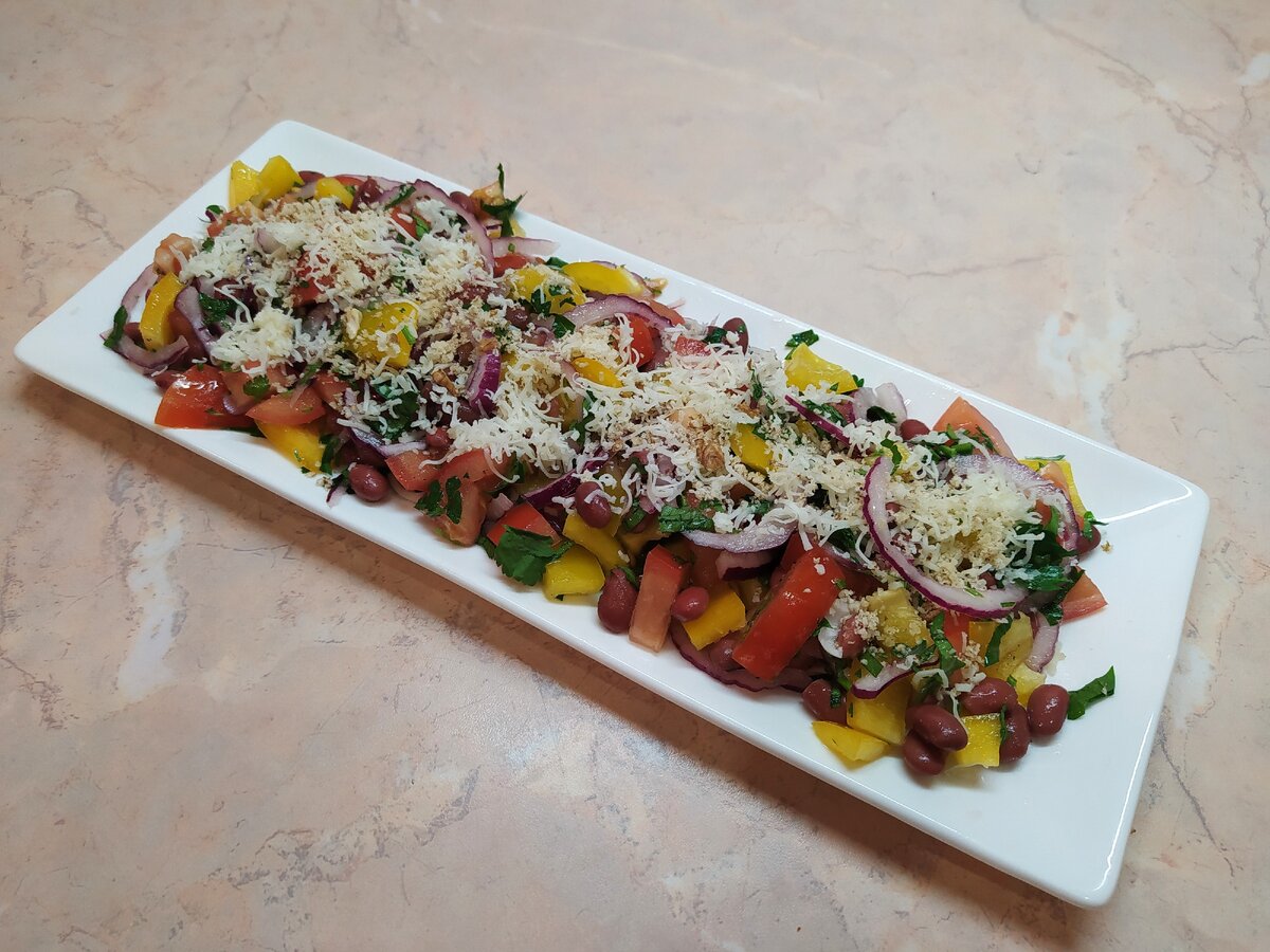 Такой салат можно есть хоть каждый день - лёгкий, вкусный, яркий и очень полезный. Готовится из самых простых продуктов, а выглядит как ресторанное блюдо. Многие, как и я не любят майонез, поэтому такой салатик для нас просто находка. Рецепт: Небольшими одинаковыми кубиками нарезаю помидоры и сладкий перец. Овощи подбираю разных цветов, чтобы блюдо было ярче и красивее. Мелко шинкую половину пучка зелени петрушки. Отвариваю 150 грамм фасоли. Когда времени нет варить фасоль, покупаю консервированную. На мелкой терке натираю твердый сыр. Для этого салата идеально подойдёт сыр, у которого ярко выражен вкус, например - гауда или голландский. Грецкие орехи натираю на мелкой терке или можно нарезать ножом, чтобы на зубок попадался. Красный лук нарезаю тоненько полукольцами. К сожалению сейчас не сезон овощей, но моя заправка делает их намного вкуснее. Нашинкованный лук немного солю, добавляю половину чайной ложки сахара. Сахар сделает зимние овощи немного летними. Добавляю три столовые ложк
