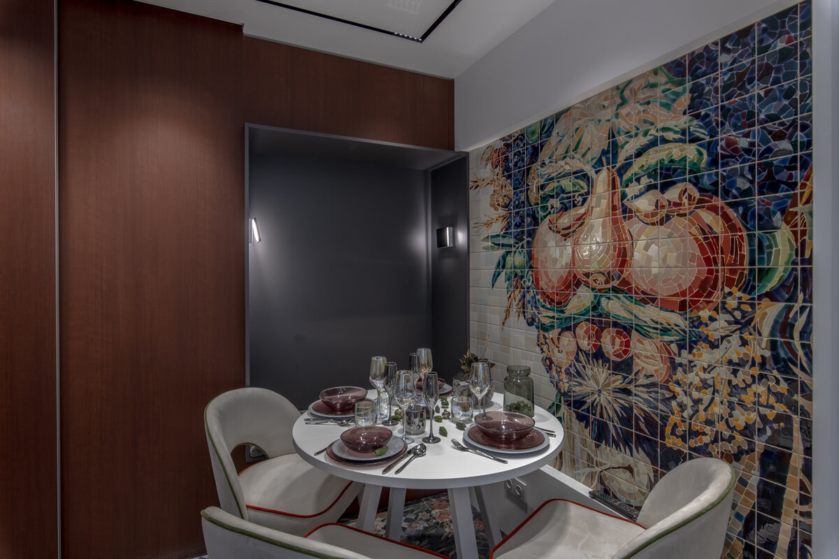 Декор стен подчеркнул зонирование пространства. Украшением столовой стало роскошное керамическое панно и стеновые панели, ставшие цветовыми акцентами интерьера. В свою очередь зона готовки стала белоснежным фоном студии фуд-блогера.