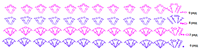 Сегодня мы продолжим вязать летний капор для девчушки, опираемся на Схему 5 и на описание к ней. Схема 5 7 ряд (Схема 5): Далее вяжем полноценную двойную рогатку из 2 ССН через воздушную петлю - это наша рогатка. Крючок вводим в воздушную петлю нижнего ряда! Так вяжем до конца ряда (Рис. 5) . 8 ряд: 9 ряд: Схема 6 10 ряд: На Схеме 6 мы видим, что на каждую "рогатку", связанную крючком, у нас приходится 7 ССН. До конца ряда в каждую петлю вяжем ССН и соединительную петлю (Рис. 7) и приступаем к вязанию рюша. А для этого мы встретимся в следующем уроке (смотрим статью ВВ 16).
