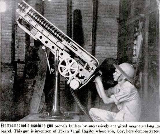 По материалам архивов «Modern Mechanix» и «Popular Science». Электричество заменяет порох в бесшумной, бездымной автоматической пушке, которую создали совсем недавно для защиты от вражеских самолетов. Электрическая пушка, изобретенная и запатентованная Вирджилом Ригсби из Сан-Августина, штат Техас, похожа на электрический двигатель с развернутыми полюсами. Мощные магнитные катушки, установленные вплотную вдоль ствола, запитываются электричеством, причем специально разработанное электрическое реле включается таким образом, что сила магнитного притяжения всегда впереди снаряда. Не изменяя своего местоположения, это оружие способно выпустить 150 пуль или снарядов, начиненных взрывчатыми веществами, в минуту. Как уже говорилось, снаряды выбрасываются из «дула» при помощи ряда электромагнитов, расположенных вдоль ствола. Магниты последовательно увеличивают скорость снаряда, после того как получают «сигнал» и питание от реле. В то время скорострельность журналисты называли невероятной, пр