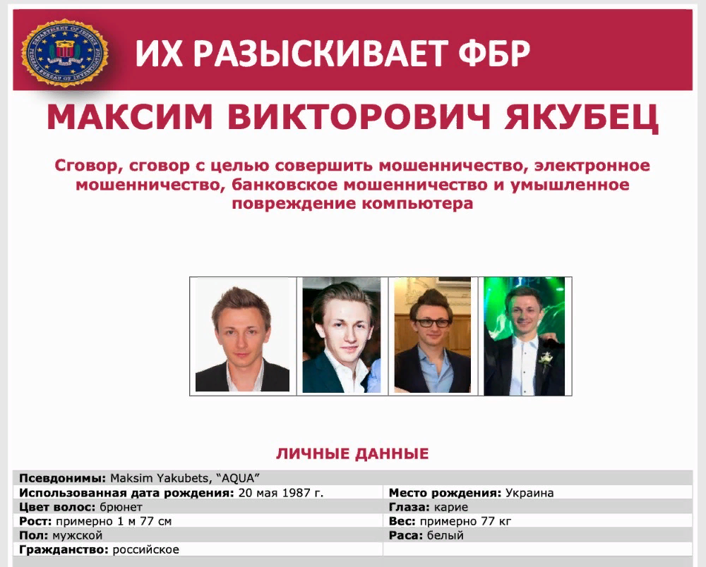 Власти США выдвинули обвинения 32-летнему Максиму Якубцу. По версии следствия, он создатель и глава крупнейшей хакерской организации Evil Corp. Якубец обвиняется в причастности к установке программы Zeus. Она распространялась через фишинговые письма и нужна была для сбора реквизитов клиентов банков. Затем эти данные использовались для хищения денег с банковских счетов потерпевших. Evil Corp воровала деньги жителей и компаний США и Великобритании с 2009 года. Общая сумма ущерба от действий Evil Corp оценивается «в сотни миллионов фунтов стерлингов». Расследование началось в 2014 году, когда Национальное агентство по борьбе с преступностью Великобритании (NCA) изучало троян Dridex. В 2015 году NCA и ФБР удалось отключить вирус, но через несколько недель Evil Corp модифицировала софт и обошла заплатки. Из подвалов московских кафе на Якубца работали десятки хакеров. По данным правоохранительных органов, Якубец проживает в Москве. В его автопарке имеются Audi R8, Nissan GT-R и Lambor