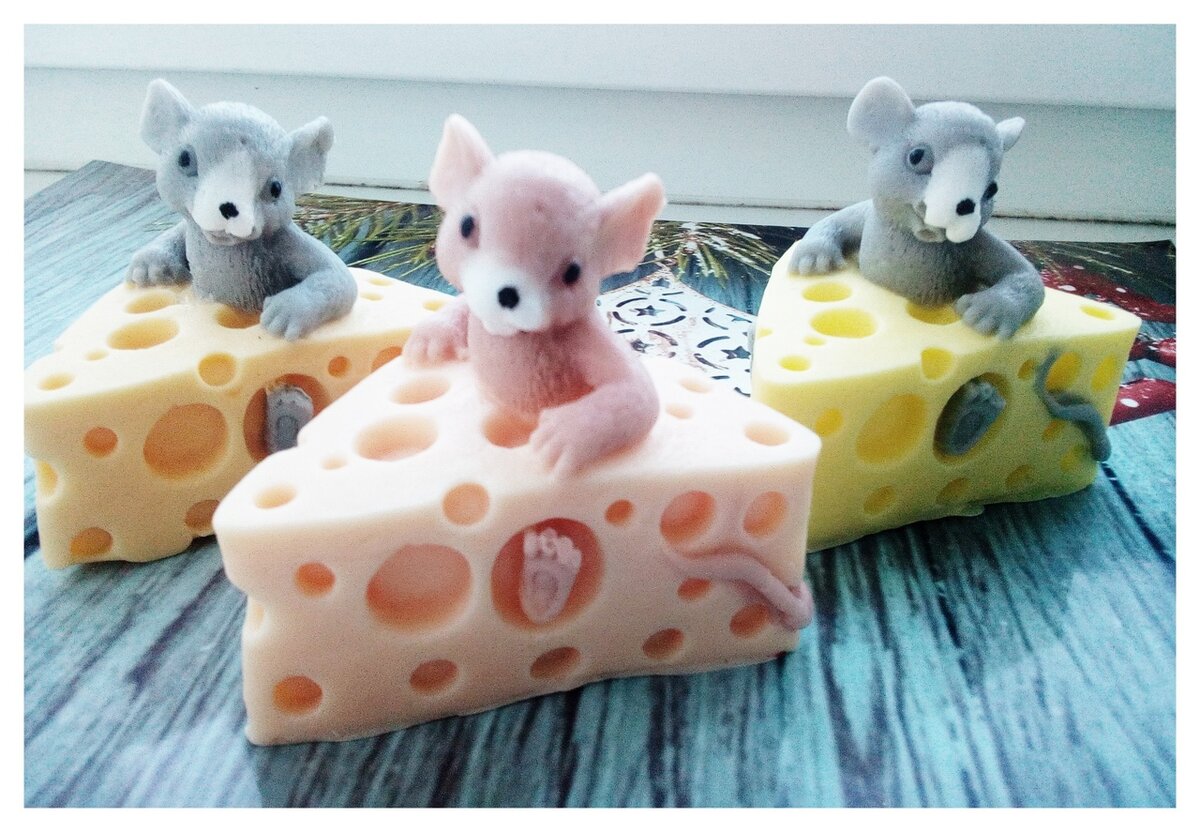 Здравствуйте дорогие читатели моего канала и не только! Сегодня я вам расскажу и насколько это возможно покажу как можно приготовить мыло самостоятельно. Это занятие понравится не только взрослым, но и детям. Готовить мы с вами будем вот такую мышку. Сейчас это очень актуально, так как мышка - символика наступающего Нового года. Для того чтобы приготовить эту милую мышку, вам понадобится: форма для заливки( у меня она из силикона), мыльная основа, красители(серый и жёлтый), отдушка, палочка для размешивания растопленной основы, стакан, пипетка( она нам нужна в помощь для проливки мелких деталей), распылитель с муравьиным спиртом. Мышка состоит у нас из верхней части(туловища) и нижней (сыра). Нарезаем мелкими кубиками немного основы для заливки туловища мышки в стакан. Ставим стакан в микроволновку и растапливаем основу пока она не станет жидкой, но не допустите её закипания. Иначе основа потеряет свои свойства. Достаём расплавленную основу, капаем несколько капель красителя до желае