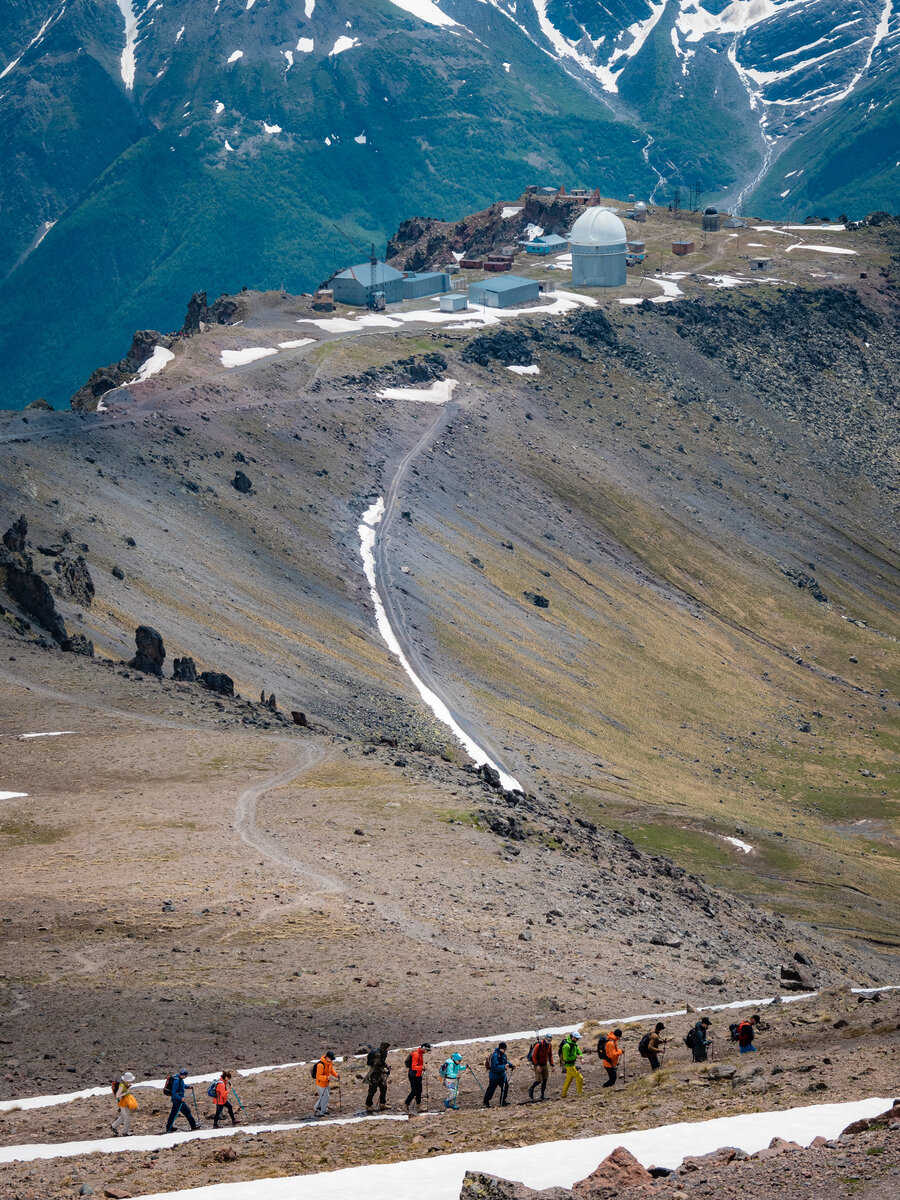 2300 м над уровнем моря, 3300 - Чегет). Нас набралась группа 15 человек из Шамика, на которую приходилось 2 гида и фотограф. Всю дорогу мы неистово прислушивались к своим ощущениям - замеряли пульс, давление и пр. - у многих были фитнес-браслеты. В итоге спустя 5 или 6 часов мы добрались до вершины Чегета, поели там чебуреков и спустились на канатке вниз.