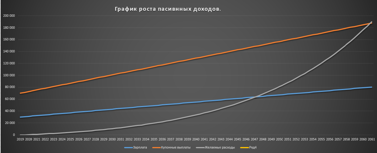 Добрый день! В предыдущей статье начали рассматривать тему финансовой свободы. Каждому возможно интересно, сколько времени займет для достижения наших пассивных доходов до ежедневных расходов. У нас есть огромное желание достичь и мы готовы откладывать 30 % от кровных и инвестировать в облигацию. Я не брал конкретную облигацию, а привел для примера гипотетическую ценную бумагу со стоимостью 1050 рублей за одну, с выплатой раз в полгода и купонным доходом 7% годовых. Скажете 7% не так уж и много, ведь есть возможность найти более выгодные облигации. На сегодняшний день среднее значение по всем облигациям варьируется от 7,5 до 8,5%. Но не забывайте о комиссии как за покупку облигации, так и за продажу. Еще за содержание брокерского счета существует ежегодные, ежемесячные так скажем абонентские платы. И другие ухищрения в той или иной степени сжигают часть нашей прибыли, поэтому примерно убавил на 1% от купонных выплат для реального подсчета. Зарплата 30 тыс. рублей и с годами от инфляции