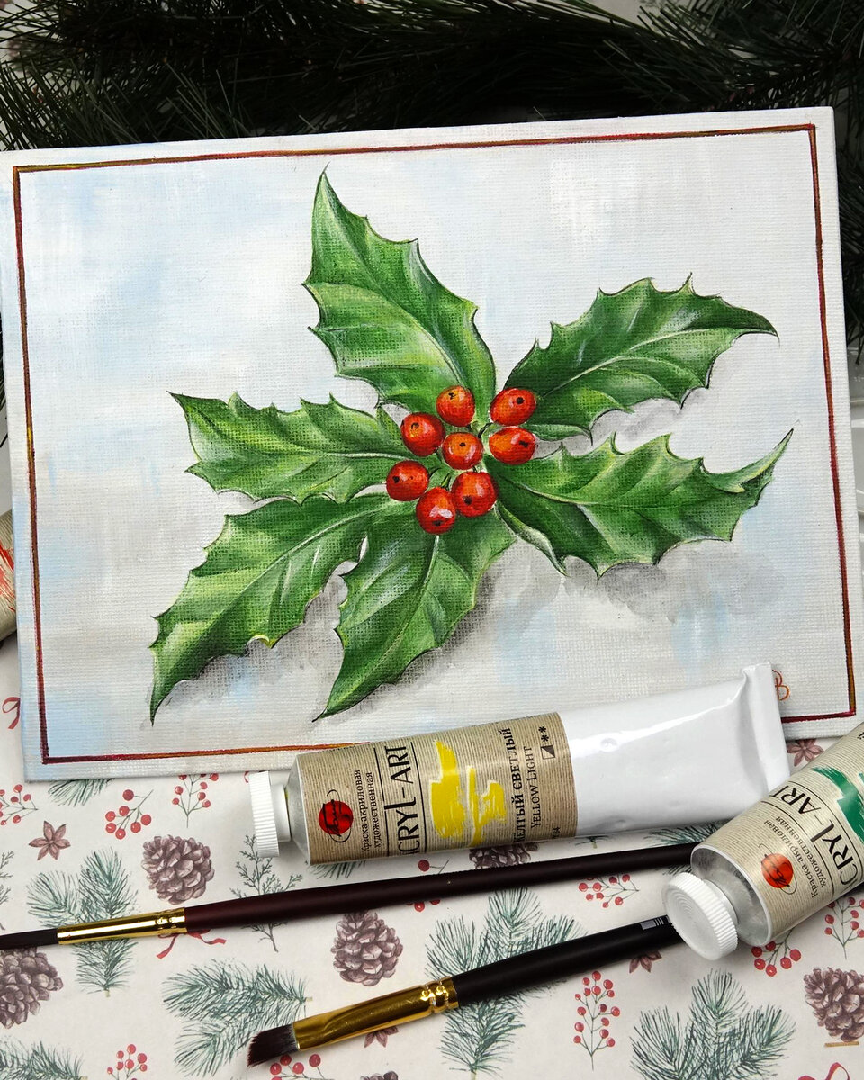 Традиционное рождественское растение остролист — прекрасная идея для праздничного рисунка на открытке 🎁 Рисовать его очень просто 😉 Просто смотрите видео и повторяйте Шаг 1 Создаём легкий набросок, тонкими еле заметными линиями. Шаг 2 Закрашиваем фон ,вводя в белила 1 или 2 цвета (например: пеньковый и нежное небо Акрил-Хобби Де Люкс). Не наносим краску на область, где будет остролист, оставляем её не закрашенной, чтобы не потерять набросок. Шаг 3 Закрашиваем листья и ягоды. Краску наносим равномерно в один тон. Шаг 4 Намечаем темные участи и тени на ягодах, листах и под растением. Работаем разбавленной водой тёмной красой, послойно накладывая тени. Шаг 5 Добавляем светлые участки и блики на гладкие поверхности листа и ягод. Шаг 6 Добавляем детали и рамку.