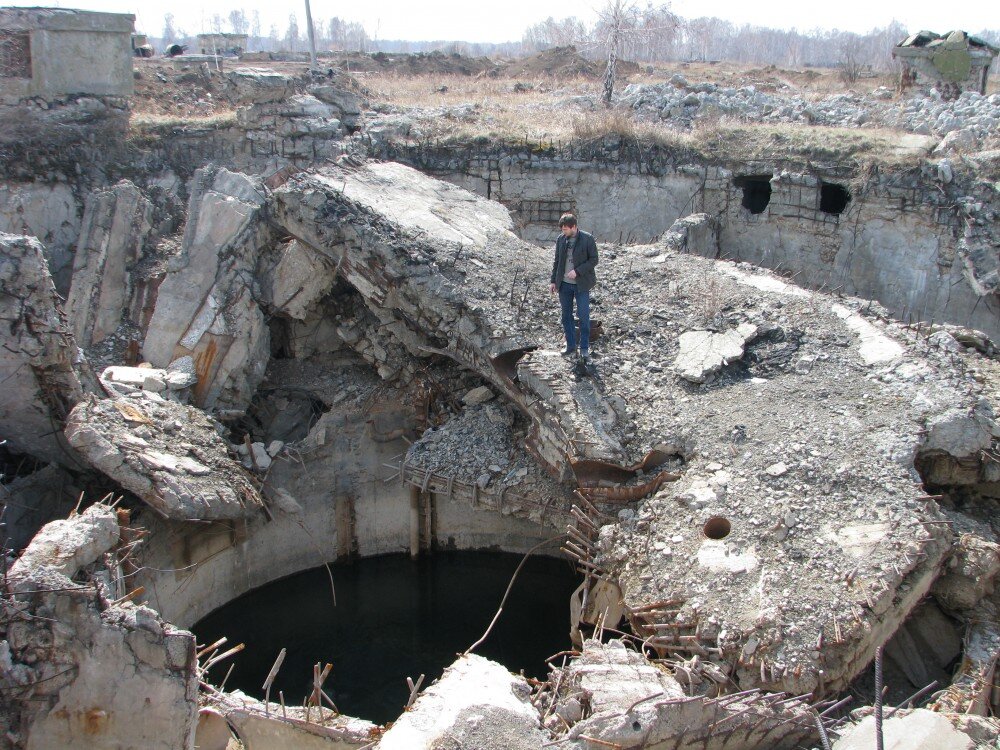Одно из моих старых фото. Собственной персоной стою у взорванной шахты , ласково названной "Борисом", омского 290-го отдельного ракетного полка, 11-я БСП и смотрю в ее темную водную глубину