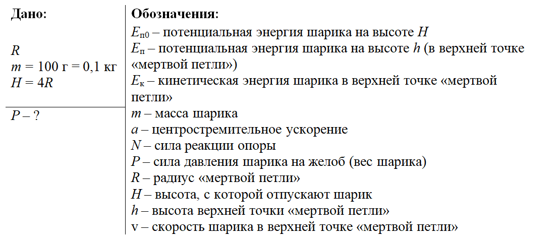 Полное условие задачи Шарик скользит без трения по наклонному желобу, а затем движется по «мертвой петле» радиуса R. С какой силой давит шарик на желоб в верхней точке петли, если масса шарика 100 г, а высота, с которой его отпускают, равна 4R, считая от нижней точки петли. Краткое условие задачи Решение задачи Запишем второй закон Ньютона для шарика, находящегося в верхней точке петли, в векторном виде: Перепишем его в проекциях на вертикальное направление OY: По модулю сила реакции опоры равна силе давления (весу) шарика на желоб: Центростремительное ускорение находится по формуле: Тогда получаем: Выразим вес: В соответствии с законом сохранения механической энергии можно записать: где: Тогда: Учтем, что: Имеем: Выразим квадрат скорости: Подставляем последнюю формулу в выражение для веса: Подставляем данные и находим численный ответ: Ответ: 3 Н.