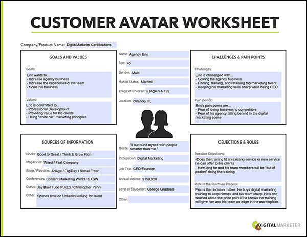Если вы еще не создали персону, попробуйте шаблон аватара клиента DigitalMarketer. Он включает в себя все, что вам нужно для начала, а также полезное объяснение того, как создать свой.