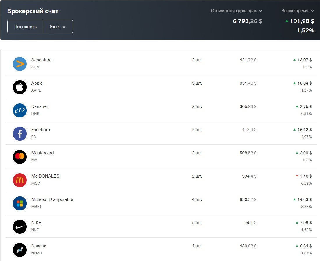 В середине декабря 2019 года, накопив достаточную сумму для составления портфеля из отдельных акций США, я продал все свои ETF зафиксировав неплохую прибыль. Ранее описывал свои результаты инвестирования в ETF за 2019 год. На конец декабря 2019 года портфель имеет следующую структуру: Доля отдельных компаний в портфеле: Структура портфеля по отраслям; Продолжаю придерживаться своей стратегии долгосрочного инвертирования, но теперь уже в растущие акции США. Стратегия довольно агрессивная, но лично мое мнение, все компании в составе портфеля имеют очень хорошие фундаментальные показатели для роста в будущем. Немного о рисках: Если посмотреть на состояние всего американского рынка , несложно заметить , что все покупки были сделаны на "хаях" (исторический максимум), но для долгосрочного инвестирования, это практически не имеет значения. График на индекс S&P500 по состоянию на 23.12.2019г. На данный момент абсолютно не важно куда пойдет рынок, поскольку в следующий 2020 год, я также план