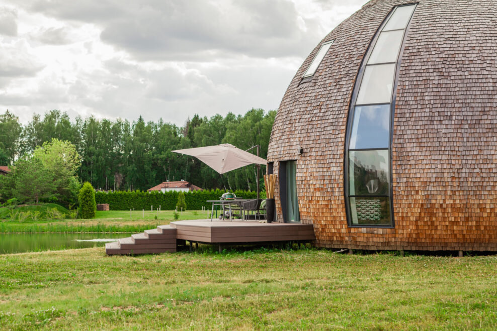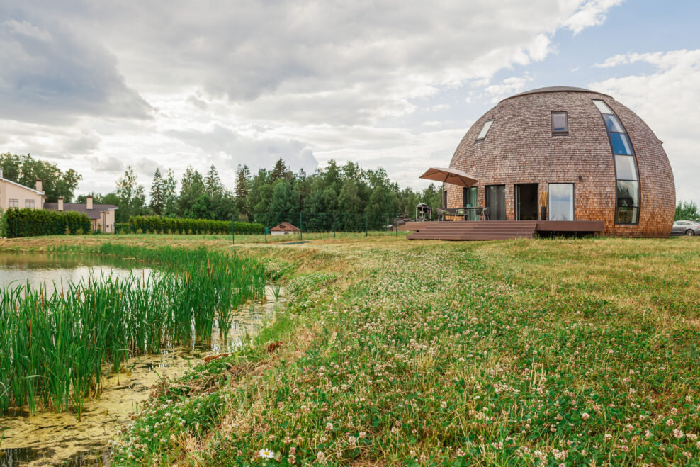 Необычный купольный дом авторства архитекторов Наталья Мошнина и Ирина Дротенко из бюро Verba Design расположен в подмосковном городе Пестово. При первом же взгляде на него возникает ассоциация с большой сказочной черепахой, вышедшей из ближайшего озера погреться на солнечной поляне. Внешние стены дома покрыты особым материалом – гонтом. Это плашки из натурального дерева, которые с течением времени будут темнеть и полностью растворят дом в окружающей природе. Площадь дома составляет 240 кв. м. и дизайнерам необходимо было рационально использовать каждый ценный квадратный метр жилья. Круглая форма конструкции создавала большие сложности с обеспечением функциональности и практичности внутреннего пространства, поэтому архитекторам пришлось искать нестандартные пути решения многих задач. У дома нет фундамента в классическом понимании – он стоит на сваях. Поэтому он не может похвастаться особыми показателями теплоэффективности. Чтобы обеспечить комфортную температуру, в помещениях на первом