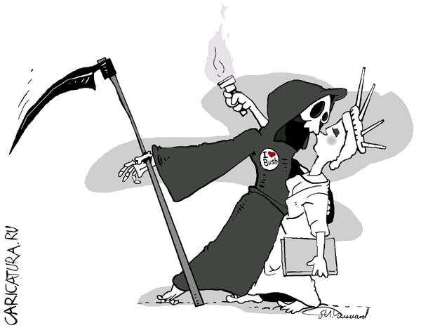 Сразу началась страшная буря и на лодке появилась смерть. И говорит им: "Друзья, погода испортилась, и вы, наверно погибните. Но, у меня есть для вас одно предложение. Кто мне задаст такую загадку, которую я не угодаю, этого спасу." Первый американец: вырвал себе волос из головы и кинул его в море, и сказал смерти, чтобы она его нашла. Смерть улыбнулась и принесла ему его. И забрала американца с собой. Второй словак: вырвал себе золотой зуб изо рта, кинул его в море. Зуб сожрала рыба. Словак говорит смерти принести его зуб. Через минуту смерть стоит перед ним, и с зубом. Только улыбнулась ему и забрала его с собой. Русский стоит и думает: "ой плохо, плохо дружок, что придумать". И вот мысль пришла, побежал в кухню, взял сито и предстал перед смертью. Приложил сито к жопе и пернул в него, и спрашивает смерти: "Через которую дырку я пернул?" Смерть начала показывать и говорит: через эту - нет, через эту - нет.... Наконец сказала: " Сдаюсь, теперь покажи мне эту дырку." Русский обвернул
