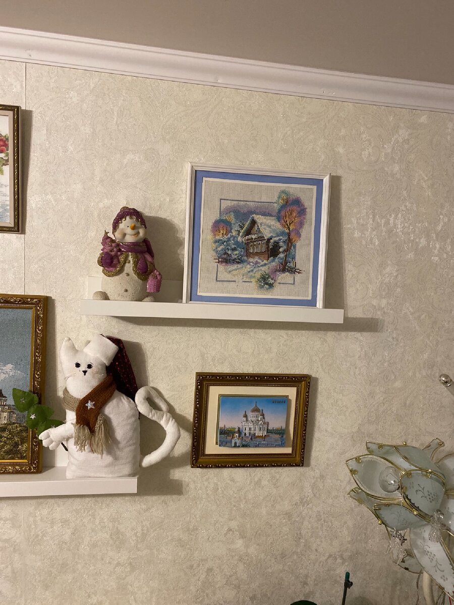 Здравствуйте, уважаемые подписчики и гости моего канала. До нового года осталась неделя ,хотя по ливню за окном не скажешь вовсе, все меня погода удивляет. Хотелось бы спросить у вас, а какая погода в предновогодние дни стоит на улице в вашем регионе и городе? Сегодня я хотела бы вам рассказать немного о том, как я украшаю свою квартиру и что мной было сделано за 8—9 лет осознанного творчества. Речь пойдет о части квартиры и ее декоре. Вообще творчеством я начала заниматься еще в первом институте и в 17 лет научилась сама вязать спицами, затем в 18 увлеклась вышиванием, теперь спустя года, даже не знаю, чего я еще не попробовала) Иногда, я называю свою квартиру— музей прикладного творчества... добро пожаловать! Итак, первый экспонат: зимний пейзаж. Вышивала я его 10 лет и я серьезно, никак он не шел и не хотел воплощаться в жизнь, но я упертая. Было очень много проектов за эти годы и иногда вышивался аналогичный формат за пару недель, но не в этом случае. Рамку купила совсем простую,
