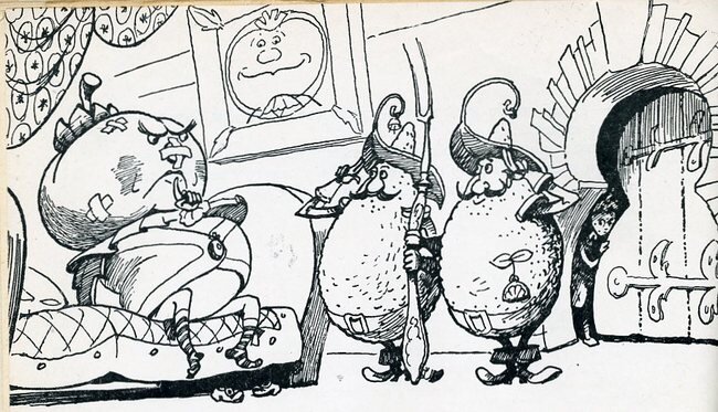 Когда барон Апельсин был ещё молод, он спал с вечера до утра, чтобы успеть переварить всё, что съел за день. Но потом он сказал себе: «Спать – это только время терять: ведь когда я сплю, я не могу есть!» Поэтому он решил питаться и ночью, оставив для пищеварения часа два в сутки. Чтобы утолить голод барона Апельсина, из его многочисленных владений, раскинувшихся по всей области, к нему ежедневно направлялись обозы с самой разнообразной снедью. Бедные крестьяне уж и не знали, чего бы ему ещё послать. Он пожирал яйца, кур, свиней, коз, коров, кроликов, фрукты, овощи, хлеб, сухари, пироги… Двое слуг запихивали ему в рот всё, что привозилось. Когда они уставали, их сменяли двое других. В конце концов крестьяне послали сказать ему, что у них больше не осталось ничего съестного. Весь скот съеден, все плоды с деревьев обобраны. – Ну так пришлите мне деревья! – приказал барон. Крестьяне послали ему деревья, и он сожрал их, обмакивая листья и корни в оливковое масло и посыпая солью.