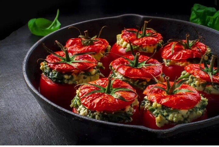 Вчера увидел этот салатик на корпоративе. Очень даже удивился что раньше не встречал такого блюда. Решил воссоздать и поделиться рецептом с вами. Чего нам прикупить. Огурчик средний 1 шт. Сметана 3 ст. л. Грудка куриная 1 шт. 3 зубчика чеснока Орегано 2 веточки. Соль Базилик 9 листочков 1 ст. ложка оливкового масла Уксус бальзамический 1ст.л. Конечно же помидоры плотные 2 шт. Приступаем к готовке Берём помидоры, моем, обтираем срезаем верхнюю их часть аккуратно вынимаем серединку, удобным для вас способом. На небольшие кусочки нарезаем грудинку. Измельчаем листья Орегано и чеснок. Теперь берём кастрюльку, выкладываем туда мясо, добавляем половину ложечки уксуса и масла, затем орегано, соль по вкусу и чеснок. Берём кастрюлю со всем содержимым. Ставим на средний огонь. Наливаем в неё воды, примерно 120 - 150 грамм, тушим до полного приготовления мяса. Одновременно с этим мы берём помидоры, натираем их солью, смазываем оливковым маслом. Берём противень, прокладываем низ противня специал