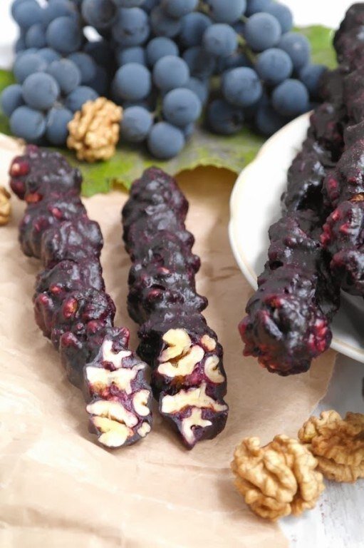 Советуем также прочитать: 1. 3 очень вкусных и несложных салатов БЕЗ майонеза 2. Как быстро приготовить коржи для торта: 10 штук за пол часа 3. Супервкусная домашняя шаурма 4. Домашнее мороженое: вкус советского пломбира! 5. 4 продукта для здоровья суставов, и 4 вредных продукта для суставов Приступаем! Поделись рецептом с друзьями Ингредиенты: Виноградный сок — 1 л Мука — 1 стак. Сахар — 0,5 стак. Грецкие орехи — 400 г Приготовление: 1. Ядра грецких орехов очистить от оболочки, разделить на половинки и нанизать их на нитку длиной 20 см. К одному концу нити обязательно привязать спичку или большой узелок, а на другом конце сделать петельку. 2. Половину виноградного сока поставить на слабый огонь, довести почти до кипения, добавить муку, смешанную с оставшимся соком (холодным). 3. Добавить сахар (количество сахара регулируйте по вкусу, все зависит от сладости винограда) и варить на маленьком огне до получения густой киселеобразной массы, помешивая. Это займет минут 5. После чег