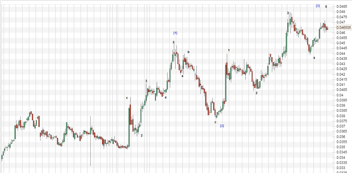 Восходящий тренд зародился в мае 2019 года. Можно четко выделить волны младшего порядка (черные) и старшего порядка [Синие]. Сейчас котировки находятся в рамках 5-[3] волны следовательно рост будет продолжен в район 0,05 за акцию. Далее будет следовать коррекция в рамках [4] волны, вполне предполагаю что коррекция будет в район 0,44 руб. за акцию. Окончание глобального роста в рамках 5ти волнового движения [синяя разметка] ожидаю на уровне 0,057-0.06 за акцию. Данный уровень выступает симметричным уровнем поддержки/сопротивления от которого цена отталкивалась на продолжительные периоды.
