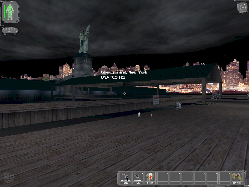 Привет друг, меня зовут ДС Дентон, я спец агент секретной службы UNATCO, на дворе 2052 год, в мире неспокойно, вовсю бушует пандемия "Серой Смерти" болезни которая распространяется с колоссальной скоростью, будто ей кто-то специально "помогает". Вакцина есть, но её практически невозможно достать, даже высшие чины при всей своей власти не могут её себе позволить, да и название странное "Амброзия". Ну да ладно, фиг с ними сейчас есть дела поважнее чем тупо размышлять и философствовать. Я только что из учебки и мне предстоит опасное задание. Сепаратисты или как их часто упоминают в новостях NSF захватили 3 контейнера с вакциной амброзии. Её и так не хватает, так они последнюю надежду у людей отнимают, сволочи! Мой брат Пол попросил прибыть сегодня на остров свободы, судя по всему террористы заняли статую, ну ни чего, попробуем пробиться. Наш катер тихо подплывал к пристани, была глубокая ночь, только звезды отражались в черной и холодной воде. Я еще раз проверил связь со штабом, все было