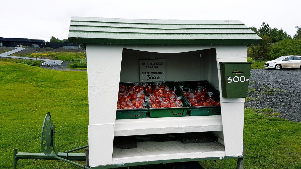 Едешь красивыми исландскими дорогами с максимально разрешенной скоростью 90 км/ч. Смотришь по сторонам на вулканы, ледники, горы, пляжи с черным песком... И тут тебе бац... помидоры. В Исландии хоть и не часто, но все же можно встретить вот такие интересные лавки по продаже всякой всячины. В данном случае помидоры. Берешь пакет, опускаешь 300 крон в "почтовый ящик" и потом эту "посылку" получает адресат, а ты имеешь вкусные помидоры в количестве 1 кг. Казалось бы, можно надуть продавца. Просто взять помидоры и не платить. Но так никто не делает. Потому что это неправильно! С другой стороны, продавец тоже в пакет может не килограмм положить, а меньше. Но и так тут никто не делает. Прямо какое-то излишнее доверие друг к другу. А, не коммунизм ли это у них? Стоимость килограмма всего 300 крон, что в пересчете на рубли - 153 рубля. В магазине такие стоят в 2,5 раза дороже, а тут, на дороге, где нет продавца, нет затрат на аренду можно продавать по 150 рублей. От такой честности, на само