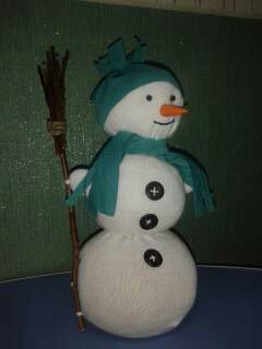 Дорогие читатели, в канун Нового года хочу продолжить тему нашего домашнего творчества и поделиться с вами ещё одной работой для детского сада. Снеговик из белого носка Для поделки я использовала новый белый мужской носок. В нижнюю часть снеговика насыпала рис, так как он тяжелый и будет придавать снеговику устойчивость. А так же рис белый и не будет просвечивать сквозь носок. В среднюю и верхнюю части снеговика я положила вату, можно использовать синтепон. Главное чтобы материал был легкий и "подвижный". Тогда легко можно "вылепить" ручки, обвязав их белыми нитками. Туловище будет легкое и не будет заваливаться в бок. Для шапочки и шарфика подойдут любые остатки ткани. Пуговки тоже могут быть те, которые вам понравятся. Глазки и ротик вышиты черными нитками. Нос из оранжевого воскового карандаша)) Ну и конечно же метла: собрана из обычных веток, перевязана бечевкой, проволокой или обычными нитками. Неизменный атрибут снеговика! Творите с вашими детьми и пусть совместно проведенное вре