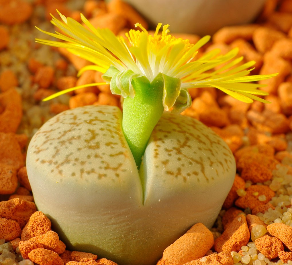 Литопсы не просто так называют «живыми камнями». Первым обнаружил это растение английский ботаник Бурчелл в 1811-ом году во время своего путешествия по пустынной области Большого Карро. Ученый решил отдохнуть и присел рядом с кучкой гальки. Он внимательно рассматривал камешки и сред них случайно обнаружил растение, которые формой и рисунком почти полностью соответствовали гальке. Так и был открыт литопс турбиниформис. Слово «Литопс» произошло из двух греческих слов «камень» и «внешность» или «lithos» — камень и «opsis» — выглядеть. Сегодня насчитывают свыше 37 видов этого необычного растения. Растение это растет в песчаных и каменистых пустынь Южной Африки, а также в Намибии, Ботсваны и ЮАР. Надземная часть растения в виде двух сросшихся толстых листа, которые разделены небольшой щелью, где растет цветонос и листочки. Литопсы представляет собоц суперсуккулентные одноствольные растения, которые имеют 2 выраженных «мясистых» листа. Глубина «разреза» варьирует от рода к роду —