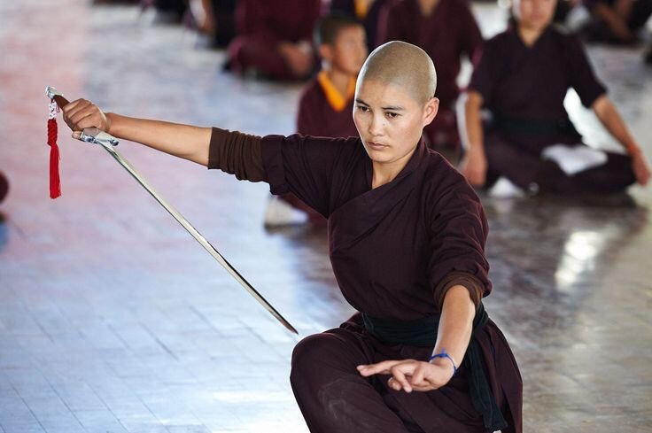 Лезвия вспыхивают в лучах утреннего солнца, молодые женщины крутятся, крутят колесо, а затем в унисон пинают их, завершая свои изящные движения в многовековой позе борьбы с кунг-фу. Одетые в одинаковые одежды и с бритыми головами, женщины и девушки заканчивают свои ежедневные упражнения и переходят к другим обязанностям в качестве монахинь-кунг-фу Гималаев, имя, которое они с гордостью приняли. Орден Друкпа является ветвью гималайского буддизма, веры, которая традиционно считает женщин второсортными гражданами. Согласно буддийским повествованиям , женщина не сможет достичь духовного просветления, если не возродится как мужчина. Идея заключалась в том, что, пока монахини готовят и убирают за монахов, они могут вернуться как монах в своей следующей жизни, а затем стать просветленными. По словам Ли, дискриминация по отношению к женщинам - это образ жизни в Непале и соседних странах. Девочек считают бременем и часто делают аборты; если они живут, они имеют ограниченный доступ к здрав