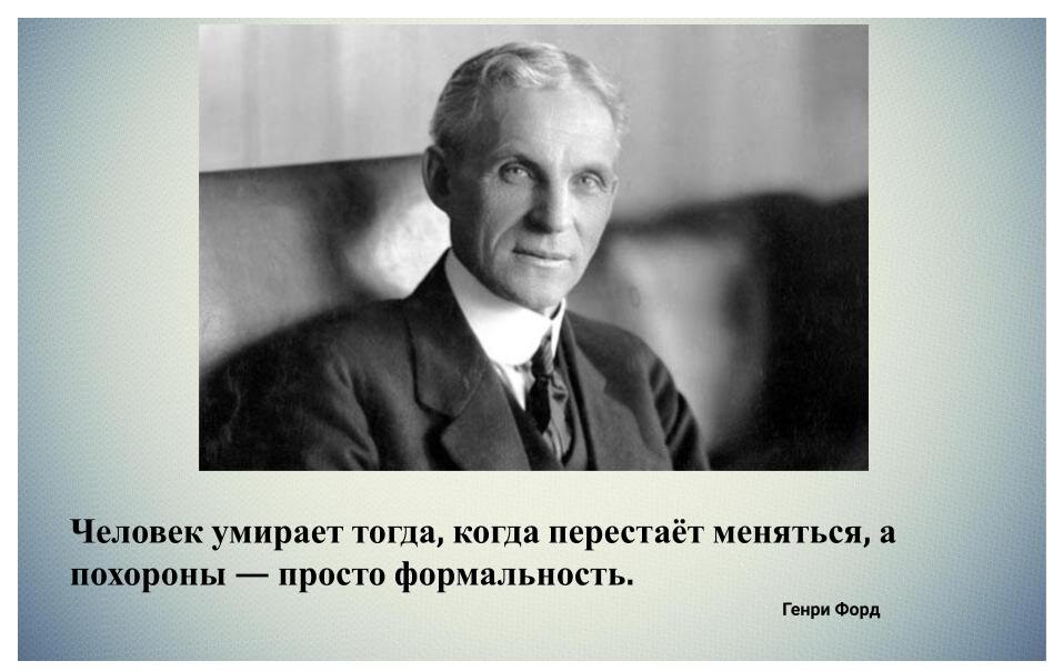 У всех гениев есть одна общая черта. Они успешные люди. Как они этого добиваются? Они умеют ломать систему. Они не в ней. Они вне системы. Именно по этой причине они видят взаимосвязи, нечто общее среди разрозненных вещей. Находят в себе силы соединить энергии так как им надо. Извлечь то, что скрыто. Переформатировать то, что является привычным и обыденным. Проиграть и начать сначала. Поражение — это просто возможность начать сначала, и на этот раз — более разумно . Г.Форд Сделать по новому и достичь результата. Мы привыкли относится к себе как к результату. Но мы - процесс. Мы меняемся. Меняются наши привычки, пристрастия. Мы по разному воспринимаем жизнь в разные периоды своей жизни Каждый, кто перестает учиться, стареет, — не важно, в 20 или 80 лет, — а любой другой, кто продолжает учиться, остается молодым. Самое главное в жизни – это сохранить мозг молодым. Г.Форд Мы меняемся и адаптируемся. Но не все. Есть те, кто меняться не хочет, но хочет изменить все вокруг. Это бессмысленн