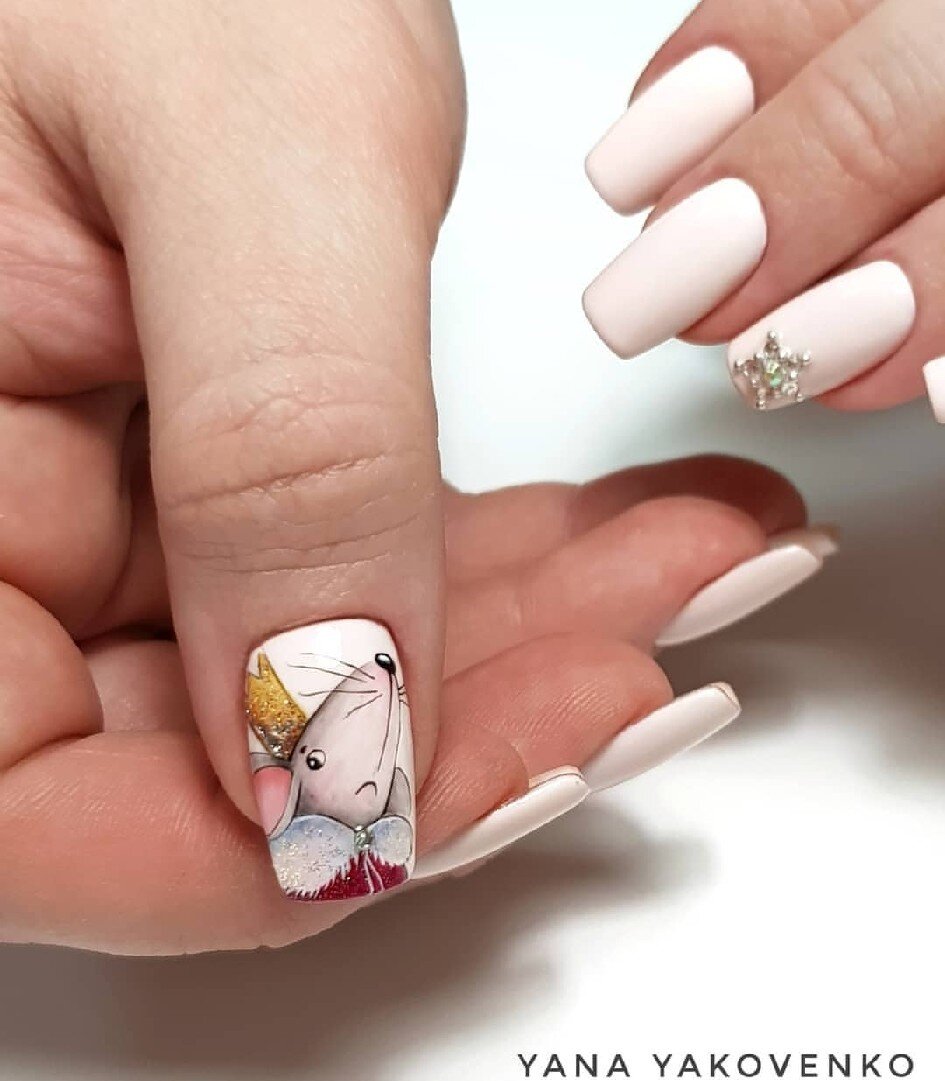 Неделя остается до Нового года, а значит, самое время обновлять свой маникюр. Безусловно, в честь праздника хочется выбрать необычный дизайн ногтей. Что же сейчас в тренде? Символ года — Белая Металлическая Крыса Конечно же, тенденции маникюра 2020 основываются во многом на символе будущего года — Белой Металлической Крысе. Мастера предлагают изящные изображения милых крысок и мышек в новогодней тематике. Как вариант — рисунки Микки или Мини Маус. Еще одно необычное решение — изображение Мышиного Короля. Мышка будет смотреться очень уместно, если остальные ногти покрыть лаком светлых нюдовых или пастельных тонов. Красивыми окажутся и глянцевые, и матовые ногти. Снежинки и шампанское Каждый раз в новогоднем маникюре повторяются примерно одни и те же тенденции. Например, всегда актуальны наклейки или рисунки снежинок, елочек, снеговиков, гирлянд, леденцов, а также «вязаные» ногти. Еще можно выбрать изображения бокала шампанского или симпатичного новогоднего оленя. Топовым цветом явля