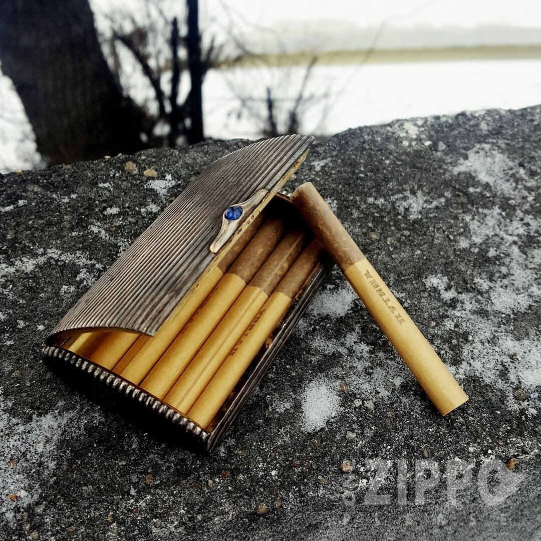 Сегодня я хочу рассказать немного о своем портсигаре, который достался мне от бабушки, ей от отца, а ему от своего отца. Проще говоря, портсигар моего прапрадеда. Точный возраст портсигара трудно назвать, поскольку вещь импортная, но имеет советское переклеймение (1923-1940 год, точно не могу сказать, в заблуждение вводить тоже не буду, я не разбираюсь в антиквариате). Сколько портсигар лежал до этого переклеймения — никто не знает. Портсигары с таким дизайном активно выпускались в 1899-1908 ГГ. Корпус покрыт серебром и местами почернел. Изнутри присутствует золотое напыление, которое хорошо сохранилось. На крышке можно увидеть два отверстия, расстояние между которыми 2.5 см. Туда крепилась именная табличка. Резиночки для сигарет в портсигаре не предусмотрены, из-за чего он начинает походить на табакерку, однако это не так.