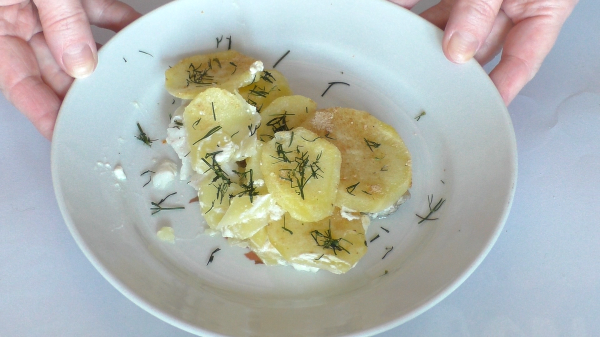 Рыба запеченная по-русски. Чтобы ее готовили в столовых я не помню, а вот в кафе и ресторанах подавали и не обязательно в рыбный день. Именно с этого блюда начиналось обучение в кулинарном училище, почему не знаю. Я буду использовать минтай, но можно взять судака, треску, щуку, леща, осетрину, на худой конец. Процесс приготовления можно посмотреть в видео ниже + еще 2 рецепта из минтая которые готовили в рыбный день, и не только, в советских столовках. Дорогие друзья, спасибо всем кто делится моими рецептами и оставляет свои комментарии Рыбу разделаю на филе (можно купить уже готовое), внутренности удалила, плавники срезала. Мясо рыбы отделила от кости. Большие косточки можно вынуть или срезать. Нарезаю филе на порционные куски. Пока их уберу. Подготовлю картофель. Нарежу его кружками и отварю. Воду солю и выкладываю туда картофель, варю его 5 минут. Пока варится картофель подготовлю заливку, я буду использовать свой вариант, сметану развожу молоком солю перчу (мне кажется так вкуснее