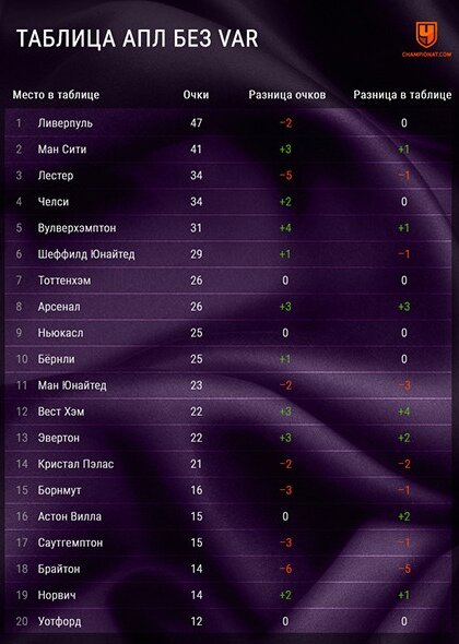 Турнирная таблица Английской премьер лиги после 18 пройденных туров,если бы не было VAR .