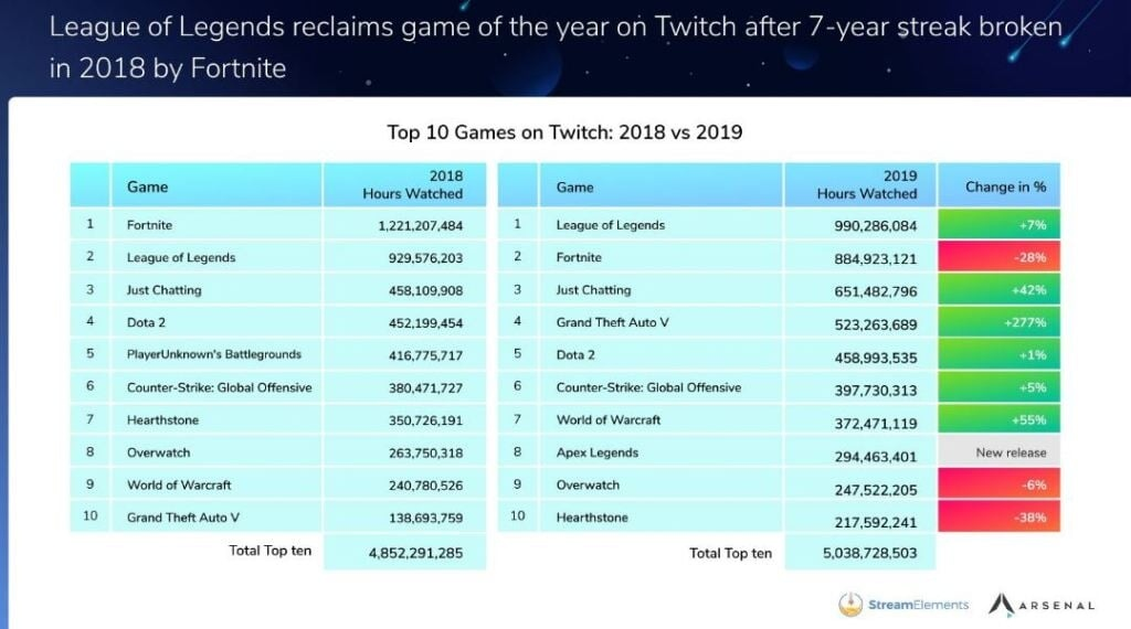 Fortnite опустилась на второе место, потеряв 28% часов просмотров по сравнению с 2018 годом. League of Legends снова заняла первое место – игру на Твиче смотрели почти миллиард часов. До 2018 года игра 7 раз подряд становилась самой просматриваемой на стриминговой площадке.