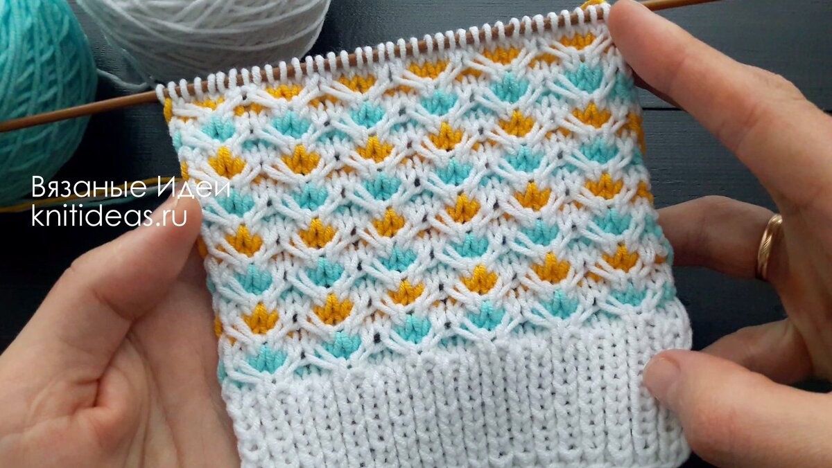 Приветствую подписчиков и гостей канала Вязаные Идеи! Сегодня я подготовила описание и видео по вязанию великолепного узора, который отлично подойдет для вязания детских вещей. Этот узор можно использовать для вязания шапочек, детских свитеров, жакетов. Раппорт 6 петель и 8 рядов. В узоре используются 3 нити разного цвета. Каждым цветом нужно провязывать 2 ряда. Я использовала белый цвет, как основной и 2 дополнительных цвета. Основные обозначения: перекрестить 3 петли с наклоном вправо - 2 петли отложить за работой на доп. спицу, 1 лицевая, затем провязать лицевыми 2 петли с доп. спицы. перекрестить 3 петли с наклоном влево - 1 петлю отложить надоп. спицу перед работой, 2 лицевых, затем провязать петлю с доп. спицы Вязание поворотными рядами: Количество петель кратно 6 +2 кром. Базовый ряд (нить А) : кром, изнаночные, кром. 1 ряд (нить В): кром, *2 лиц, 2п. снять(нить за работой), 2 лиц*, повторять от * до * до конца ряда, кром. 2 ряд (нить В): кром, * 2 изн, 2 п. снять (нить пе