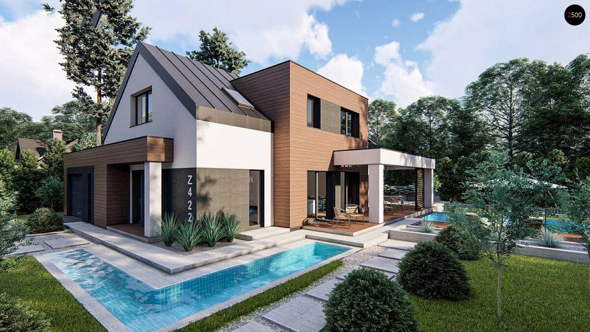 Z422 Дом с двускатной крышей, современным мансардным этажом, боковой террасой и гаражом