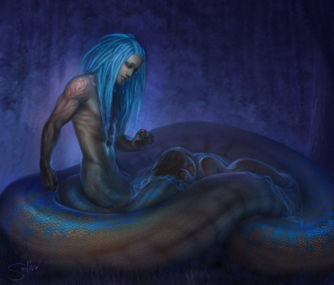 Змей опешил от такой отваги. Конечно, в то время скрываться от простого люда причин не было, особенно такому могущественному представителю своего народа. Однако, сколько он ни пытался прочесть её потаённые желания, у него ничего не выходило. Единственное, что он ощущал, так это то, что она - человек.