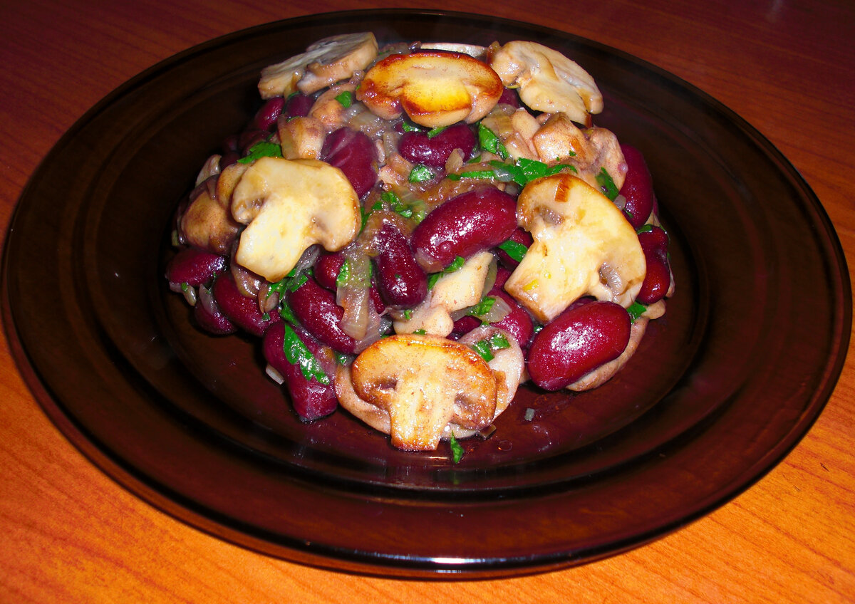 Лук мелко порежем. Грибы нарезаем тоненько. На растительном масле обжариваем лук до золотистости. Добавляем грибы и оставляем томиться около 10 минут на среднем огне. Режем зелень петрушки мелко. Смешиваем отварную фасоль, тушеные грибы с луком, зелень петрушки. Приправим перчиком, посолим, хоро