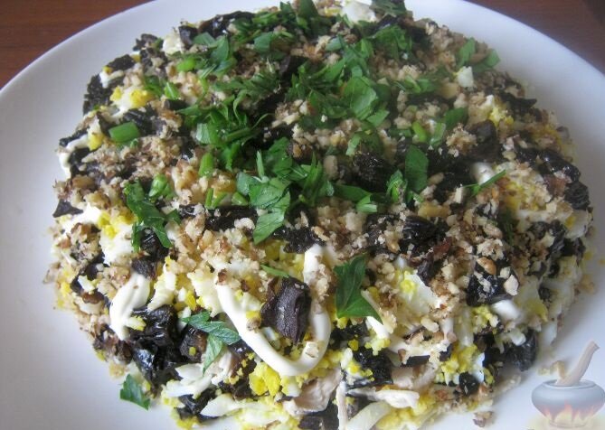 Продукты (на 10 порций): 1.Куриная грудка - 500 г. 2.Яйца куриные - 4-5 шт. 3.Огурец свежий - 1-2 шт. 4.Чернослив - 150-200 г 5.Грецкие орехи - 100 г 6.Зелень - по вкусу. 7.Перец - по вкусу. 8.Соль - по вкусу. 9.Майонез - 100-150 г. Пошаговый фото рецепт Салат из курицы с черносливом "Дамский каприз" 1. Куриное филе помыть. Выложить в кастрюлю, залить холодной водой. Довести до кипения, посолить. Варить на небольшом огне до готовности (около 30 минут). 2. Яйца залить холодной водой, посолить (1 ч. ложка), поставить на огонь, довести до кипения и варить на среднем огне 10 минут. Остудить. Очистить. 3. Натереть куриные яйца на терке. 4. Куриное филе охладить, порвать на кусочки руками или нарезать кубиками. 5. Помыть, очистить от косточек чернослив. Нарезать кусочками. 6. Огурцы свежие помыть, нарезать брусочками. 7. Грецкие орехи раздавить скалкой, измельчить. 8. Собрать салат "Дамский каприз" с курицей и черносливом.