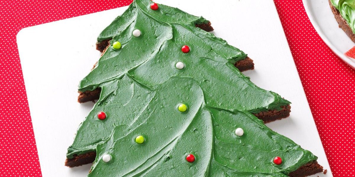 Вырежьте из коржа ёлочку, распределите по ней глазурь и украсьте конфетами.